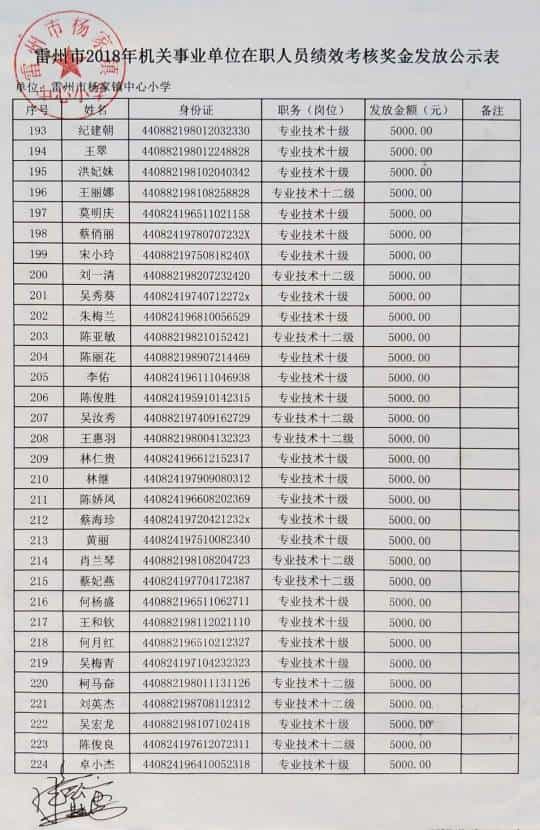 2018年杨家镇小学在职、退休人员绩效考核资金发放公示