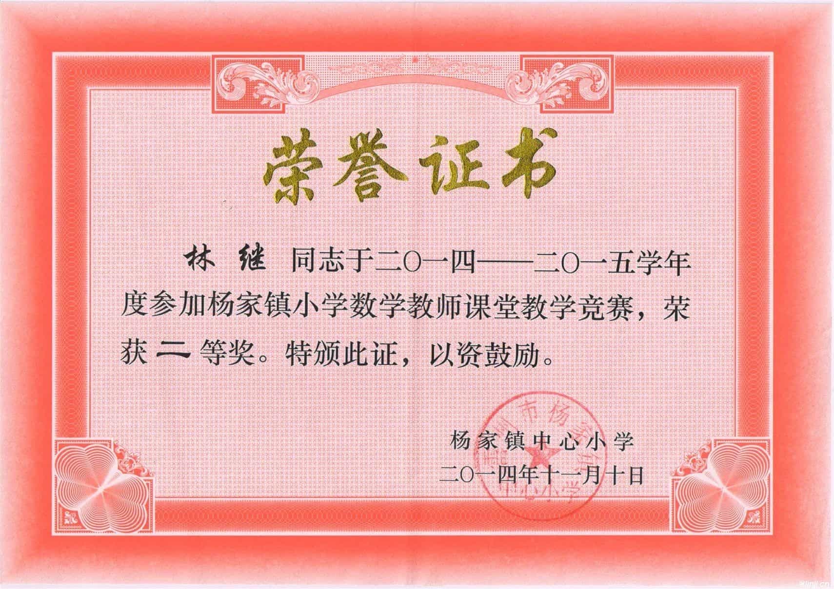第 16 张证书:林继同志于二0一四——二0一五学年度参加杨家镇小学数学教师课堂教学竞赛,荣获二等奖。特颁此证,以资鼓励。杨家镇中心小学,二0一四年十一月十日