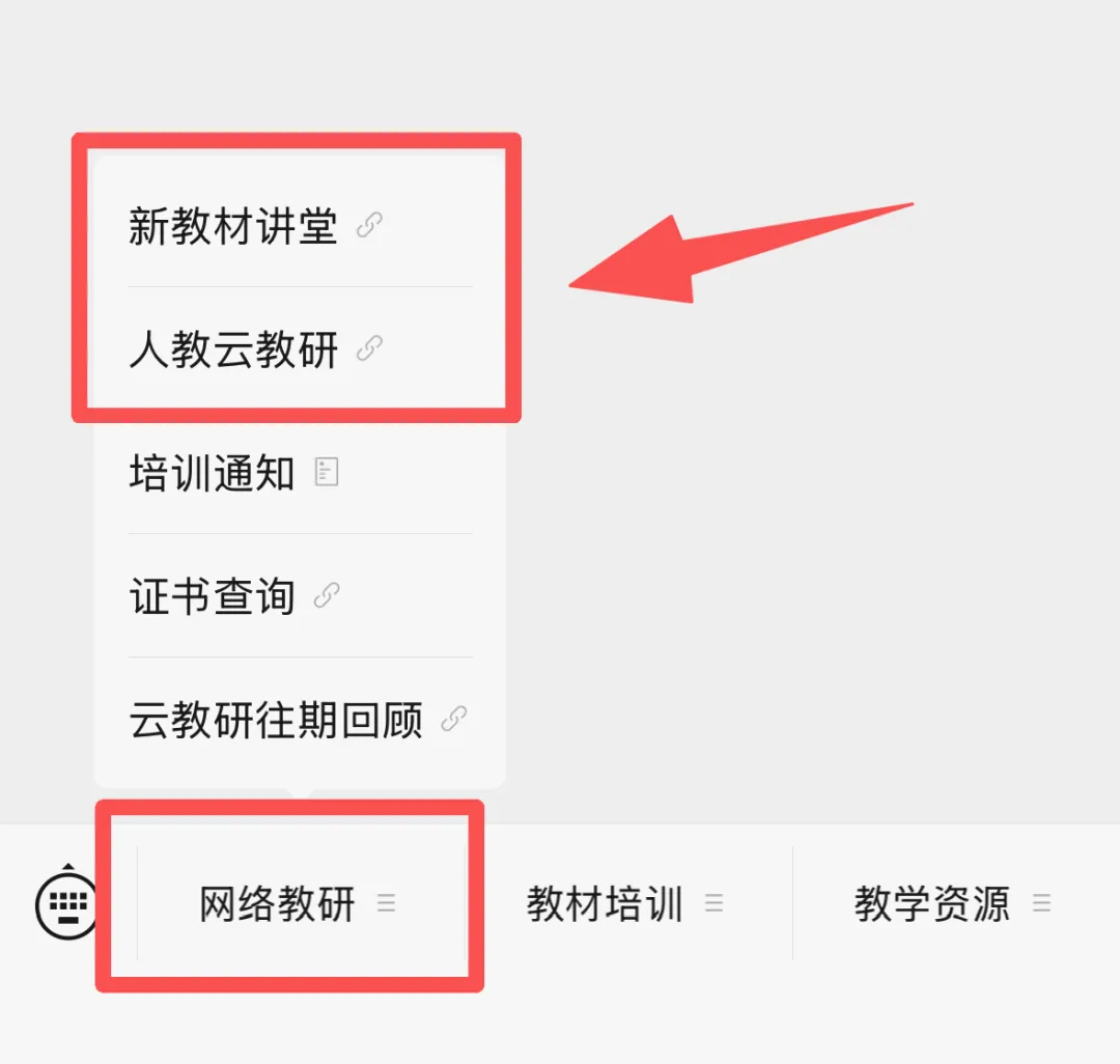 方式一:手机端收看通过“教材人之声”公众号菜单栏“网络教研——新教材讲堂”和“网络教研——人教云教研”可直接访问活动主页。