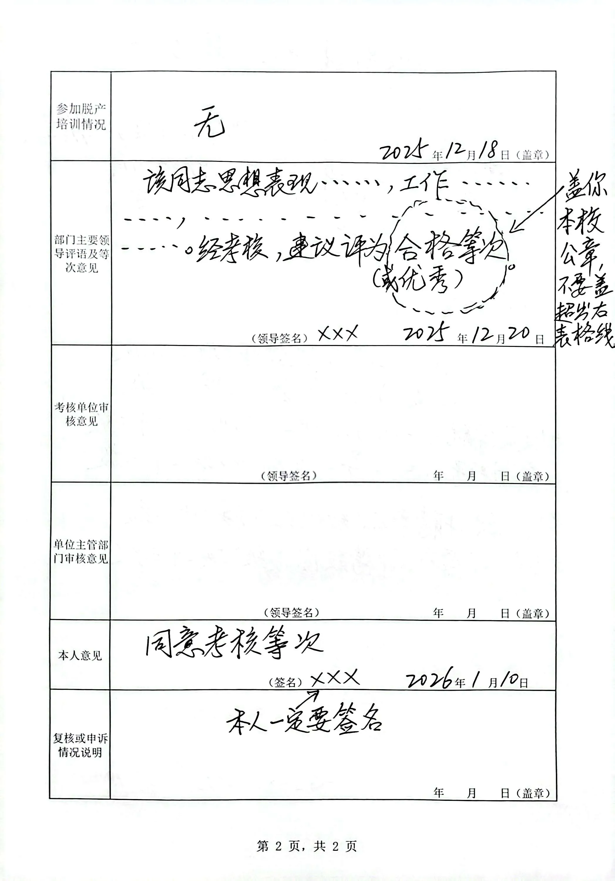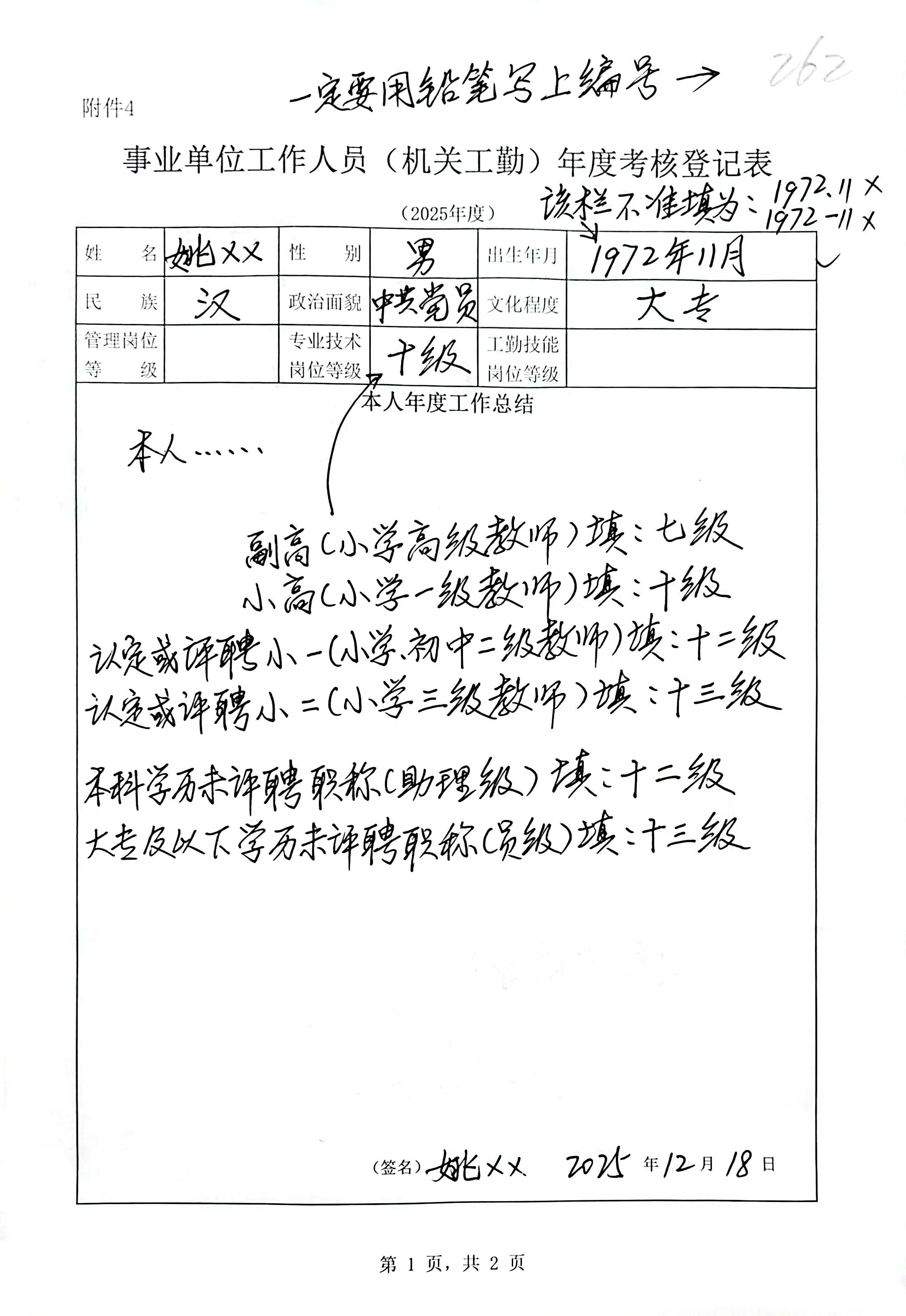 1、参考微信上面的范例,要求教师本人填写时一定要先用铅笔在考核登记表右上角写上自己编号(详见微信上面的《杨家镇小学2025年年度考核教师信息及叠表编号》表格第一列的编号),表格内容要用黑色笔填写,第1页底端本人要签名和填写时间(按范例时间),第2页第一栏本人要填写,第五栏(本人意见栏)本人填写上“同意考核等次”和本人一定要签名和填写时间(按范例时间)。填表时书写要工整,字迹要清楚,容易辨认;
