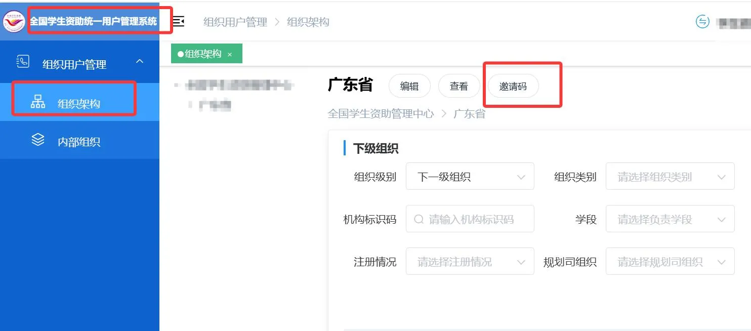 3.主管部门的系统管理员提供邀请码给学校,登陆《全国学生资助数字化平台(https://pt.xszz.edu.cn)》-->>点选进入《全国学生资助统一用户系统》-->>组织架构-->>邀请码。(详见图1和图5)