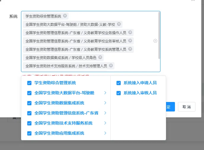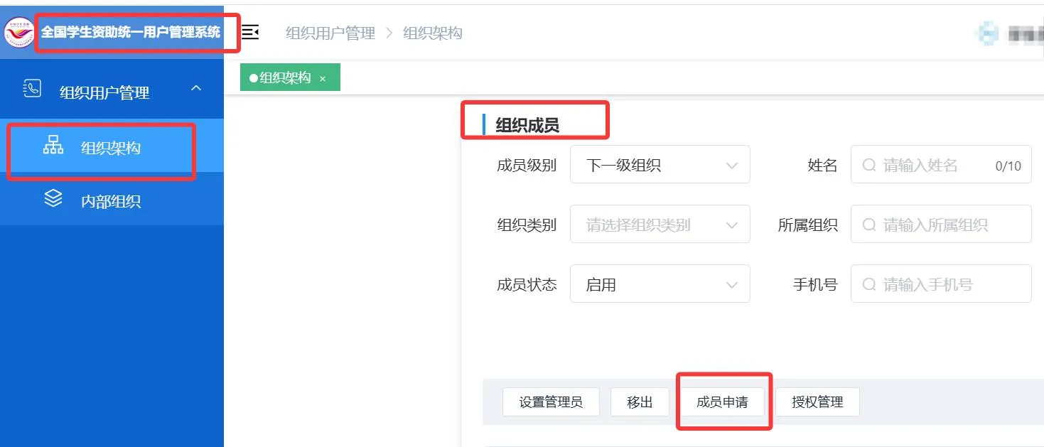 5.主管部门的系统管理员登陆《全国学生资助数字化平台(https://pt.xszz.edu.cn)》-->>点选进入《全国学生资助统一用户系统》-->>组织架构-->>组织成员-->>成员申请-->>批量通过。(详见图1和图8)