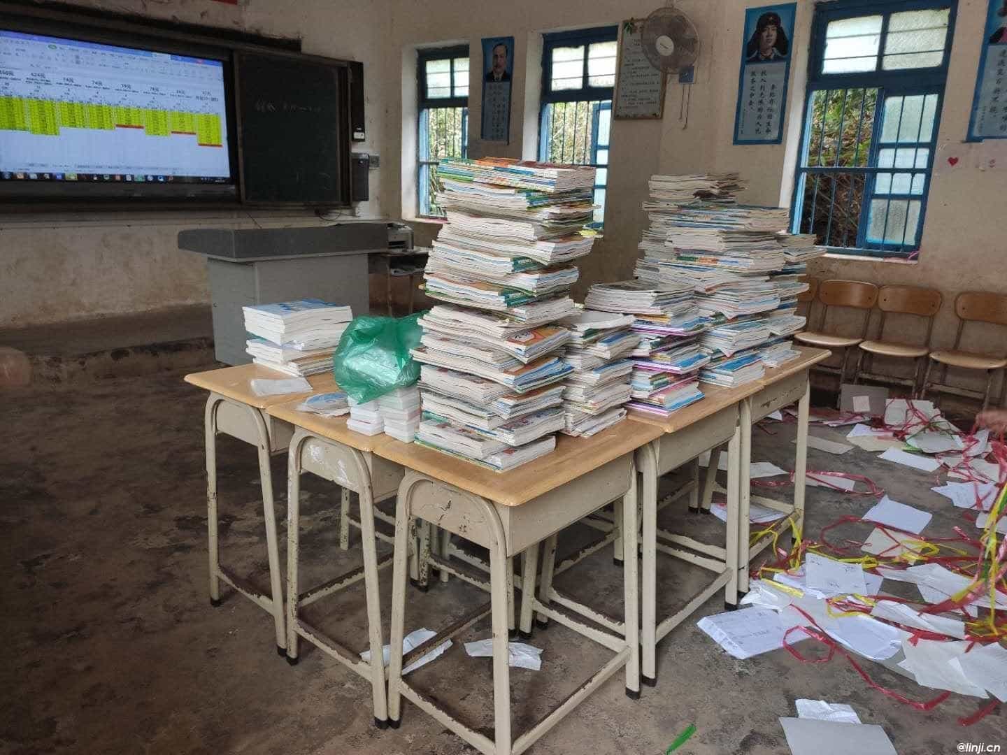 正在运送课本回校(林仁贵、林继、黄丽、陈娇凤),按班级、学生分拣好课本。量体温,签名,领课本。