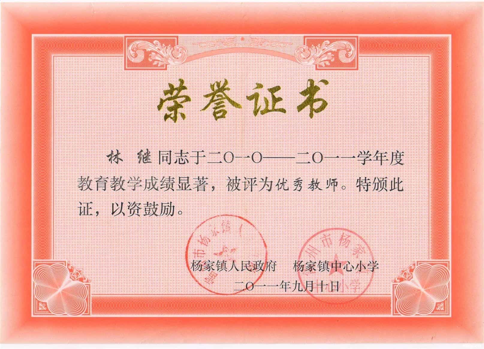 第 8 张证书:林继同志于二0一0——二0一一学年度教育教学成绩显著,被评为优秀教师。特颁此证,以资鼓励。杨家镇人民政府,杨家镇中心小学。二0一一年九月十日