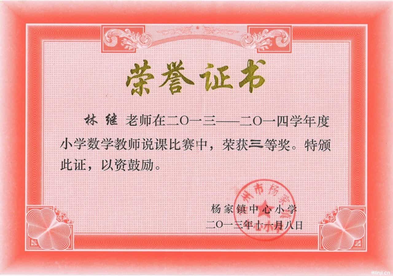 第 11 张证书:林继老师在二0一三——二0一四学年度小学数学教师说课比赛中,荣获三等奖。特颁此证,以资鼓励。杨家镇中心小学,二0一三年十一月八日