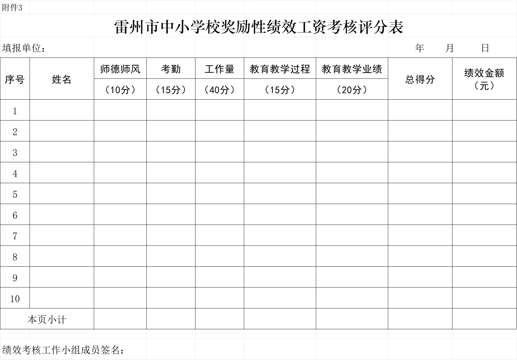 2、请依据你校的《雷州市杨家镇XX小学教职工奖励性绩效工资考核方案》,按照上学期的考核方法,对本校教职工(含派入支教你校的教师)本学期奖励性绩效工资进行考核(不能考核出全校所有教职工的金额都相同),然后填报《雷州市中小学校奖励性绩效工资考核评分表》(该表最后一列的“绩效金额”要保留整数,并且全校的合计金额要与微信上面的“奖励性绩效工资汇总表”中你校的发放金额相一致);