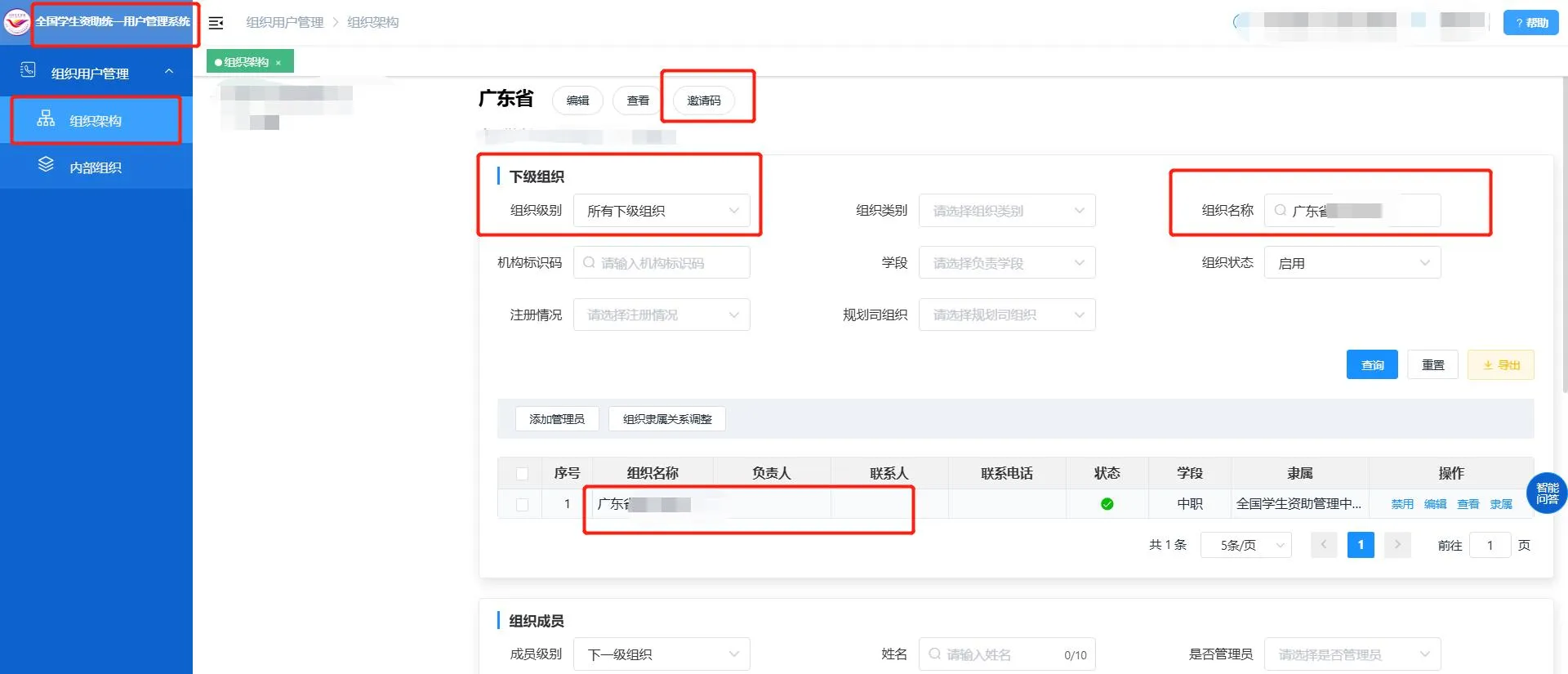 1.主管部门的系统管理员登陆《全国学生资助数字化平台(https://pt.xszz.edu.cn)》-->>点选进入《全国学生资助统一用户系统》-->>组织架构-->>下级组织-->>组织级别,选择所有下级组织-->>组织名称,输入学校名称-->>查询(能查找到的学校都可以通知学校自行进行手机注册账号)。(详见图1和图2)