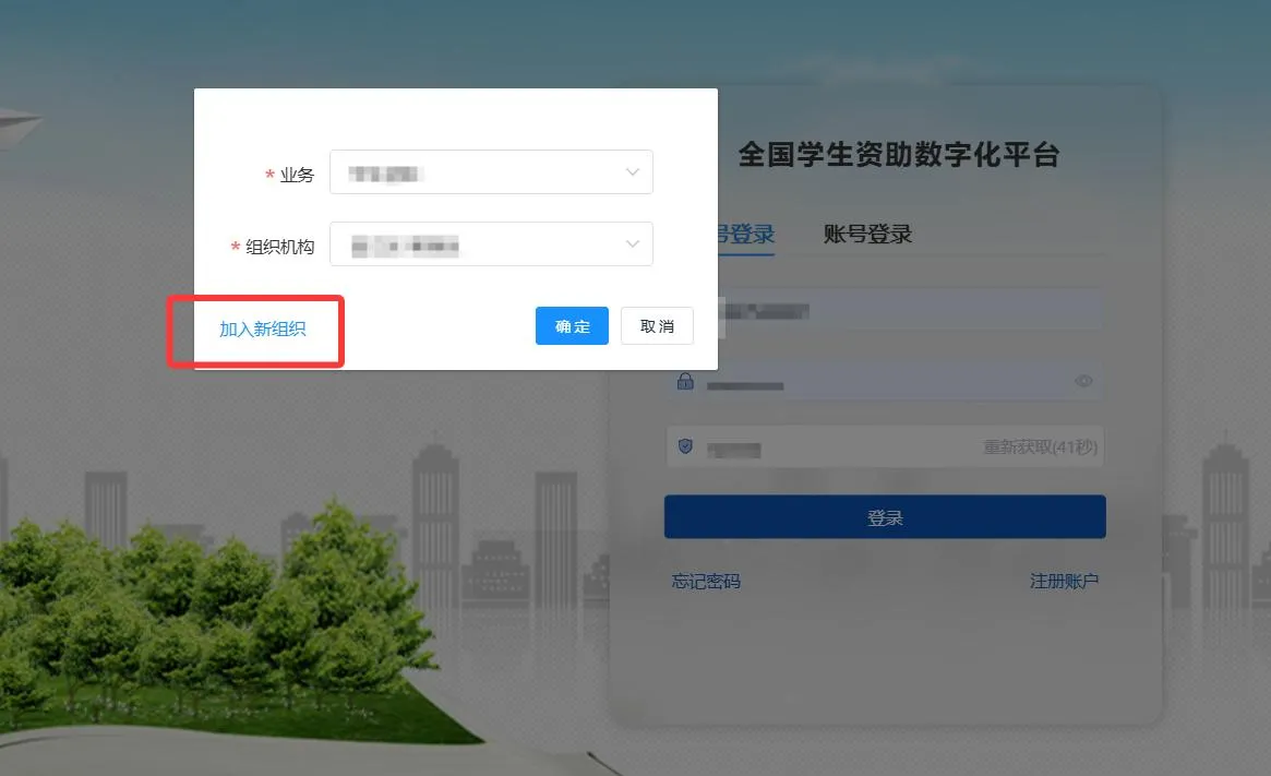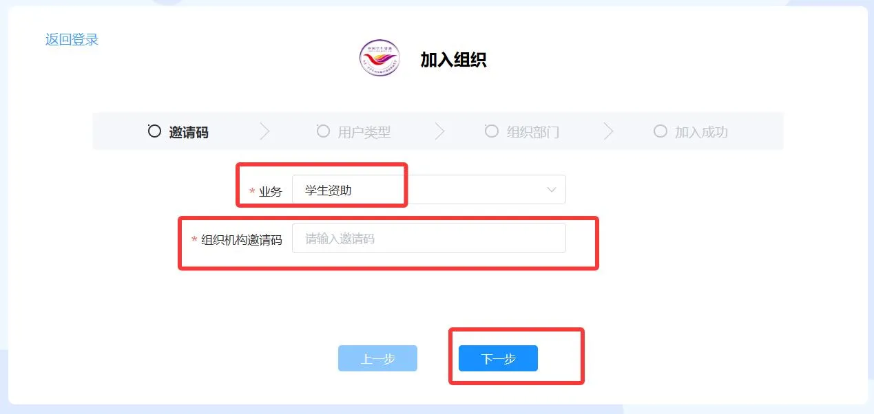 4.学校用自行注册的账号加入组织,学校用自行注册的账号登陆《全国学生资助数字化平台(https://pt.xszz.edu.cn)》-->>在弹出的对话框上点选“加入新组织”-->>业务-->>学生资助-->>组织机构邀请码-->>填入邀请码-->>下一步-->>选择申请角色(本级成员、下级组织管理员、直属学校管理员)-->>选择申请加入的组织>>选择处室(科室)-->>加入组织。(详见图6和图7)