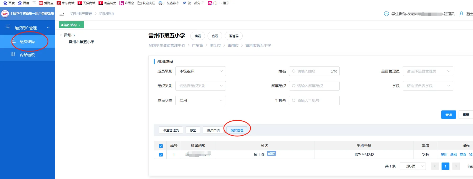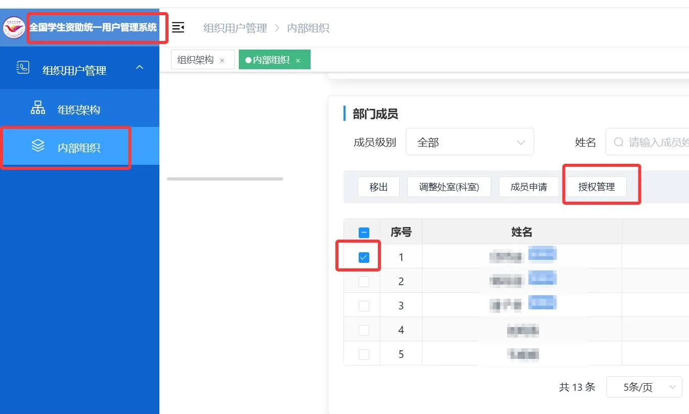 6.为学校账号授权登录“全国学生资助管理信息系统(学前、义教、高中、中职)”,学校管理员登陆《全国学生资助数字化平台(https://pt.xszz.edu.cn)》-->>点选进入《全国学生资助统一用户系统》-->>内部组织-->>部门成员-->>勾选用户-->>授权管理-->>确定。(详见图1和图9)